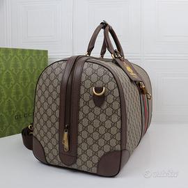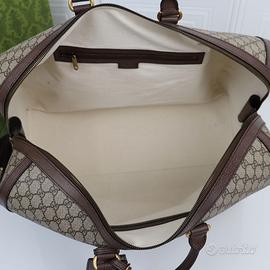 Questa borsa da viaggio Gucci Savoy è realizzata nell'iconica tela GG Supreme beige ed ebano. L'iconico logo a doppia G e il nastro sono impreziositi su tutta la superficie, rendendo omaggio al fondatore del marchio. Una tracolla regolabile in tela consente la personalizzazione, rendendo questa borsa incredibilmente versatile. Numero di modello 724612 (marrone albicocca). Dimensioni: 52 x 32 x 32 cm.