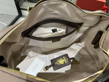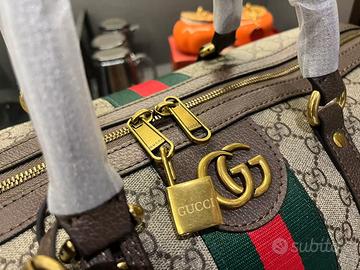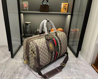 Questa borsa da viaggio Gucci Savoy fonde sapientemente il motivo GG e gli elementi in fettuccia a righe con una palette di colori moderna, esaltando lo stile urbano di un classico accessorio da viaggio. È realizzata in tela GG Supreme beige ed ebano, finiture in pelle verde smeraldo e marrone, finiture dorate, fettuccia rossa e verde e fodera in misto cotone e lino.