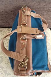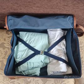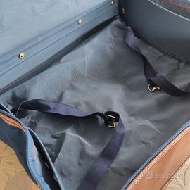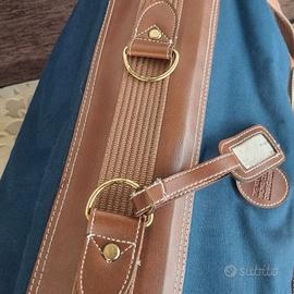 Valigia/borsa da viaggio della linea "The Martini Racing Club Collection", caratterizzata da un design vintage di pregio. Il corpo è in tela resistente, con profili, maniglie e rifiniture in similpelle color cognac cucita a punto bianco. Caratteristiche principali: ►Marca: The Martini Racing Club Collection ►Dimensioni: 50 × 40 cm + profondità 15 cm (vuota) / 25 cm (piena) - tracolla 100 cm ►Esterno: tela canvas blu con rifiniture in pelle cognac ►Accessori: fibbie, anelli e borchie in ottone dorato ►Interno: fodera blu con cinghie a X regolabili e tasca con zip ►Porta-indirizzo: in pelle, incluso Condizioni: Nuova