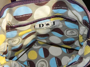 Borsa in pelle David Jones Parigi, ecopelle trama coccodrillo, colore viola, fodera in denim trama fantasia, particolari metallici dorati, tiretti zip con catena e medaglia con logo DavidJones, uno scomparto interno più tre tasche di cui una a zip, due tasche esterne a zip, lucchetto con chiave e custodia in pelle, poggioli. Usata in ottime condizioni. Dimensioni (LxPxA): 37 x 15 x 30 cm circa.