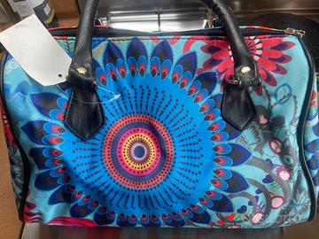 Vendesi borsa con disegni tipo mandala di fiori sui toni dell'azzurro e del blu, materiale: 80% poliuretano e 20% cotone, misure: larghezza 30cm, profondità 17cm, altezza 20cm, manici 40cm.