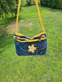 Vendo borsa campiente, nuova, mai usata di jeans; Con due piccole tasche anteriori e dettagli giallo paglierino.