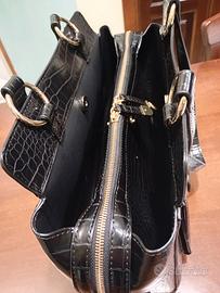 La borsa di pelle martellata presenta nella parte interna due tasche laterali e nella parte centrale una chiusa con cerniera.Nella parte esterna da un lato c è una tasca chiusa con una nappina.