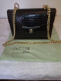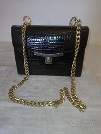 Borsa di pelle e vero coccodrillo anni 70 a tracolla con catena dorata acquistata c/o il famoso negozio di pellicceria e borse Ceresa in via del Tritone 120 a Roma, come nuova indossata solo 1 volta le condizioni sono perfette senza alcun difetto, oltre la dust bag nell' interno della borsa ha lo specchietto che si usava a quei tempi nelle borse di lusso, altezza 23 cm larghezza 16 cm profondità 8 cm sono disponibili altre foto in caso di interesse