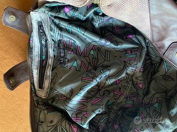 Borsa Armani jeans particolare in vera pelle morbidissima, di colore testa di moro con doppia chiusura, con lampo che circonda tutta la borsa e due chiusure con clip sopra la lampo coperte da due applicazioni di pelle. Utilizzata 5/6 volte ha la fodera interna tutta scritta Armani. Misure 50 centimetri larghezza, 23 centimetri altezza e 14 centimetri la profondità quando è piena.