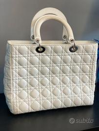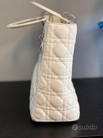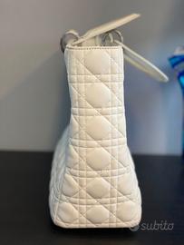 Iconica Lady Dior nella misura Large, realizzata in pregiata pelle di agnello bianca con la classica trapuntatura Cannage.