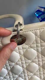 Manici rigidi, tracolla in pelle regolabile/removibile, charm pendenti “D.I.O.R.” in metallo argentato. Interno con fodera monogrammata Dior beige.