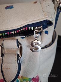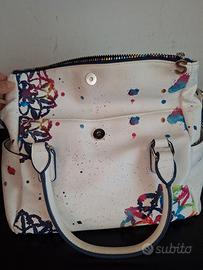borsa desigual sfondo bianco con disegni multicolor sul viola