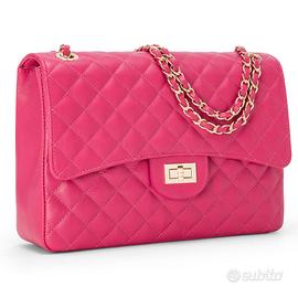 Elegante borsa donna a spalla e tracolla, nuova e imballata, colore fucsia, realizzata a Firenze in vera pelle liscia e morbida. Design raffinato tipo Chanel, con tracolla a catena intrecciata. Inclusa sacca antipolvere.