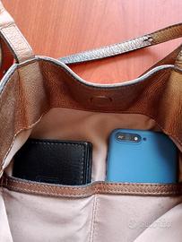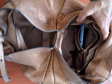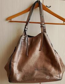 Borsa donna a spalla "Gianni Chiarini" Firenze, realizzata in morbida pelle bronzata dalla grana maxi, presenta tasche laterali con zip, due scomparti interni, di cui uno con doppia tasca e l 'altro tasca con logo e zip. Molto pratica, usata ma ancora bella, presenta segni usura come da foto.