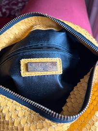 Borsa donna a spalla , KATE KOLL , colore giallo . Lavorazione a squame . Genuine lather . Forma rettangolare . Misura base cm.29 - altezza cm. 20 - profondità cm. 12 .Tracolla regolabile cm .100 .