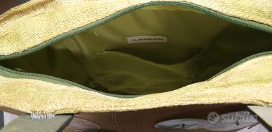 VENDESI BORSA DONNA MARCA "ALMAPLENA", NUOVA E MAI USATA. IN TESSUTO VERDE FODERATA IN TINTA CON TASCA INTERNA E DECORATA CON MADREPERLE, MANICI IN LEGNO IN TINTA. LEGGERA, RAFFINATA E CAPIENTE. MISURE