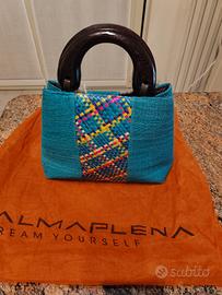 Vendo borsa da donna marca Almaplena mai usata, in tessuto azzurro con decorazione fantasia, foderata internamente, con tasca interna e manici in legno.