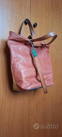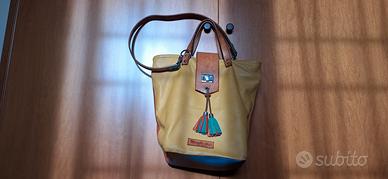 Borsa artigianale in vera pelle in 3 colori, con manici e tracolla, chiusura antiscippo con cerniera e provvista di 2 tasche interne di cui 1 con cerniera. Usata pochissimo.