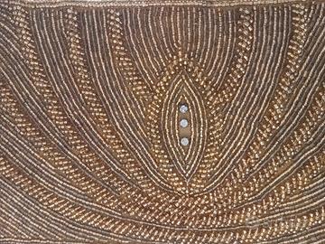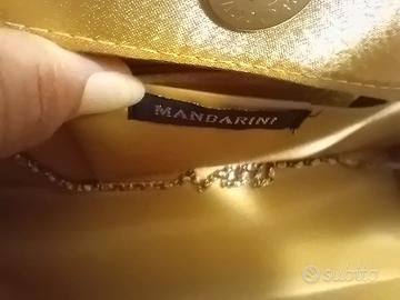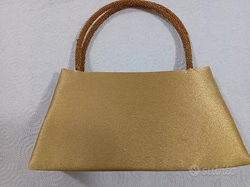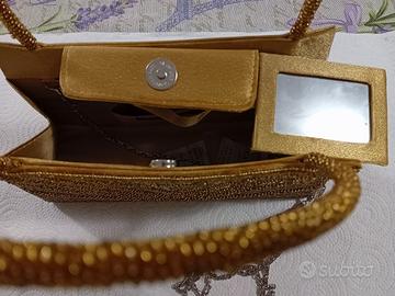 Piccola borsa con manici e tracolla in metallo impreziosita da una miriade di perline color oro sul davanti e sui manici. piccolo taschino interno con specchietto.