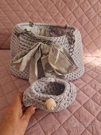 Vendo Borsa Donna cucita a ucinetto, Colore Griggio - Viola , insieme con una piccola borsino per rossetto ecc, 2 manichi argentate lucidi di catena, (con piccoli difetti sotto)