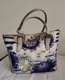Borsa donna Desigual con manici regolabili, grandezza media, in tessuto lavabile, colore bianco, grigio chiaro e gamma del viola.