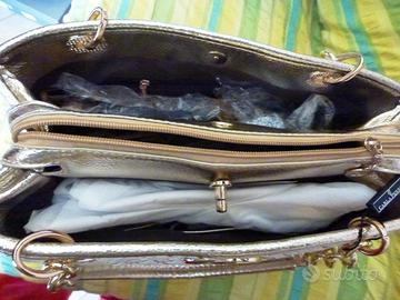 Borsa donna dorata in ecopelle da portare a mano o a spalla con manico in metallo a catena.