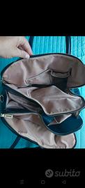 Borsa donna, blu, Miss Lulù, 40x28x11, capiente anche per il PC. Ha 3 scomparti con porta documenti e porta cellulare. Usata ma in discrete condizioni. I manici sono un po' usurati. A prezzo pieno costa 69,99.