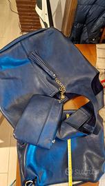 Borsa donna in pelle blu scuro, con pochette a parte, portafoglio e portachiavi interni. Ottime condizioni pari al nuovo