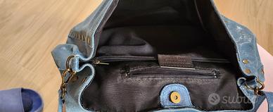Borsa in pelle modello postina, prodotto artigianale, colore blu jeans, misure 35x28x17, tracolla removibile, luce del manico 19 cm, 2 tasche interne con cerniera, nessun difetto ed in ottime condizioni.