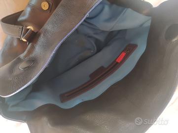 La borsa è in pelle nera, morbida e in buonissime condizioni della Mywalit. Ha un interno in tessuto (integro) azzurro e una comoda tasca. Puo' essere portata a tracolla o a mano. E' capiente.