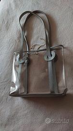 Vendo Borsa donna in pvc trasparente Con finiture in finta pelle grigia Dimensioni: Larghezza 30 cm Altezza 26 cm Profondità 10 cm Usata con qualche segno di utilizzo