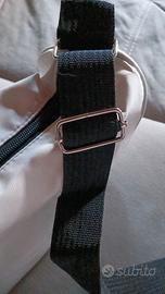 Semplice borsa a tracolla regolabile, chiusura a cerniera. Internamente ampia ma senza tasche o scomparti. Colore panna. Mai utilizzata.