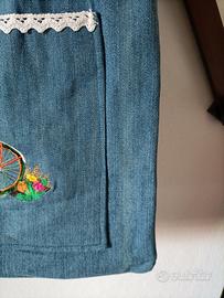 borsa donna jeans fatta a mano con tracolla. Disegno bicicletta ricamato con ricamatrice. cmq 38x35. riga leggermente scolorita sul jeans come da foto