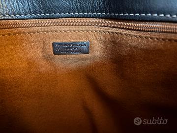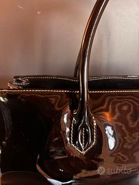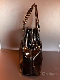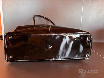 Stefano Serapian - Milano - Borsa tote in pelle verniciata nera - Made in Italy Elegante borsa firmata Stefano Serapian Milano Condizioni ottime! Come nuova! Realizzata in pelle verniciata nera lucida con cuciture a contrasto color avotio. II design presenta una struttura morbida e capiente, caratterizzata da linee pulite e dalla classica costruzione artigianale del marchio milanese. La borsa è dotata di doppio manico rigido per utilizzo a mano o a spalla corta. L'interno è rifinito in alcantara color marrone e presenta una tasca centrale con chiusura a zip che divide lo spazio interno in due ampi comparti. All'interno è presente la targhetta metallica con incisione Stefano Serapian - Milano - Made in Italy. Il fondo è rinforzato con piedini metallici protettivi. L'insieme riflette lo stile sobrio ed elegante tipico della pelletteria Serapian. Marca: Stefano Serapian Milano Produzione: Made in Italy Materiale esterno: pelle verniciata (patent leather) Materiale interno: alcantara Manici: doppio manico rigido Chiusura: tasca centrale con zip Fondo: piedini metallici protettivi Dimensioni approssimative