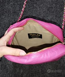 -È una borsetta di parubi, a tracolla, realizzata in vera pelle, trapuntata, sauvage fucsia