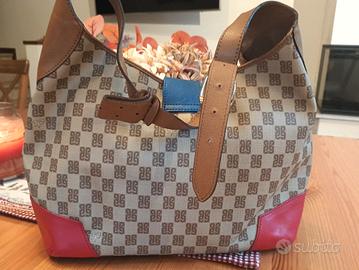 Borsa donna "Pietro Guidi" chiusura metallica con barretta dorata. Tessuto goffrato monogramma riporti in pelle. Disponibile per altre foto
