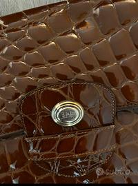 Elegante borsa a tracolla con finitura lucida effetto coccodrillo. - Materiale: similpelle lucida - Colore: marrone - Chiusura con bottone a pressione - Tracolla regolabile