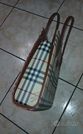 Presenta il motivo a quadri beige, nero e rosso tipico del brand, con l'emblema del cavaliere ripetuto sul tessuto. Sulla parte frontale è visibile un inserto ovale in pelle con il logo in rilievo.