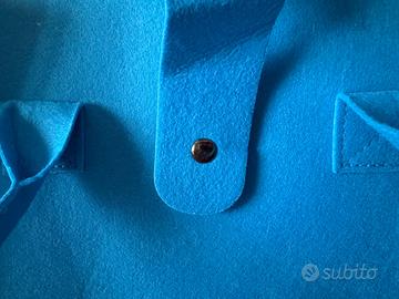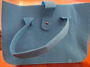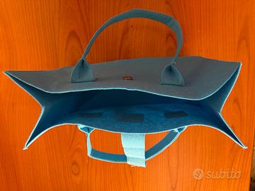 Borsa donna colore azzurro-turchese, in tessuto feltro. Misure 37lx26hx14p. Con bottoncino magnetico per la chiusura e due manici.