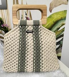 Borsa fatta a mano tecnica macramè, manici di legno.