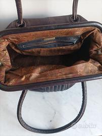 Borsa donna a spalla, bellissima, very vintage. Marca Tentazione 2. Foderata, con tasca interna, chiusura particolare tipo clic clac. Senza targhetta materiale, credo pelle. Un po' vissuta nelle parti di attrito, fondo e lati (foto). Colore marrone, misure: sorsa senza manici cm 28×44×16, altezza manici 27. Ottime condizioni