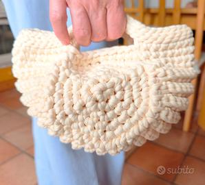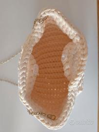 Vendo borsa donna fatta ad uncinetto, fatta a mano, artigianale in fettuccia panna con catenina color ottone per tracolla. Articolo nuovo mai usato e disponibile, possibile altri colori su richiesta previo contatto