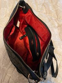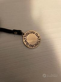 Questa borsa nera è un modello Gattinoni. Si tratta di una borsa a tracolla o sacca a spalla, caratterizzata da una raffinata trama "logata" su tutta la superficie e un pendente circolare con il nome del brand.