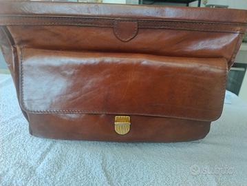 Borsa da medico artigianale in cuoio , con capiente tasca esterna con chiusura a patella, ampio vano interno foderato in tessuto impermeabile e dotato di tasca con zip e fettuccia porta strumenti.