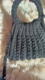 Questa è la mia nuova dusk bag simil maglione: fatta intrecciando fettuccia di cotone e lana in un grigio scuro bellissimo 🖤