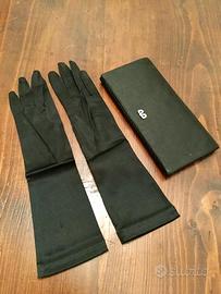 Borsa e guanti Originali e Nuovi Anni 50. Mai usati, perfetti in ogni dettaglio, in condizioni impeccabili. La stessa borsa e guanti di Audrey Hepburn in "Colazione da Tiffany". La pochette si chiude con aletta e i guanti in seta nera completano la miss. Un tocco chic, per rendere unico qualsiasi tipo di outfit li accompagni. Per un tocco elegante vintage introvabile. Tre pezzi unici unici. Bellissimi.