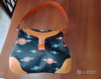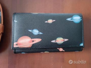 Ostia - Borsa a tracolla e Portafoglio in cuoio ZOON per donna. Allegro motivo di pianeti colorati. Vendo borsa a 10 euro e Portafogli a 7. Oppure insieme a 15 euro totali
