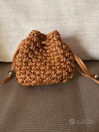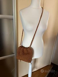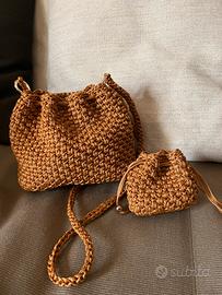 Bellissima borsa con portamonete abbinato fatti interamente a mano all’uncinetto con fettuccia di qualità. Tracolla amovibile. Intreccio e modello ispirati all’iconica borsa di Bottega Veneta. Pezzo unico!