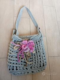 Borsa a tracolla realizzata all'uncinetto con un grazioso fiore decorativo applicato, chiusura con bottone e tasca interna nella borsa, completa di sciarpina abbinata.