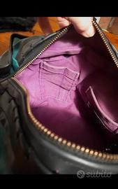Presenta un interno a contrasto cromatico, dotato di vari taschini compreso portachiavi con moschettone.