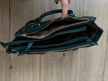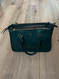Bellissima handbag in ecopelle London fog. Capiente con tre zip interne. Colore verde scuro. Tracolla regolabile con ganci (opzionale). Lunghezza 33 cm, altezza 22 cm, profondità 11 cm.