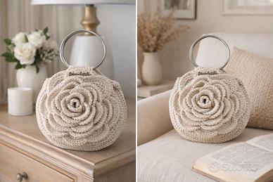 Borsa a mano rotonda in tessuto lavorato con decorazione floreale in rilievo.