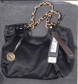 Borsa piccola ma abbastanza capiente, nera, dal tessuto lucente ed elegante caratterizzata dal manico a catena e pelle.