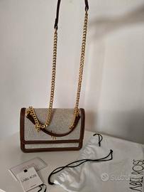 Borsa in PU testa di moro e Canvas. Dettagli metallici color oro. Portabile a spalla o tracolla. Taschine interne con e senza zip. Chiusura a scatto. Completa di dustbag e cartellino. Usata una volta. Perfette condizioni.